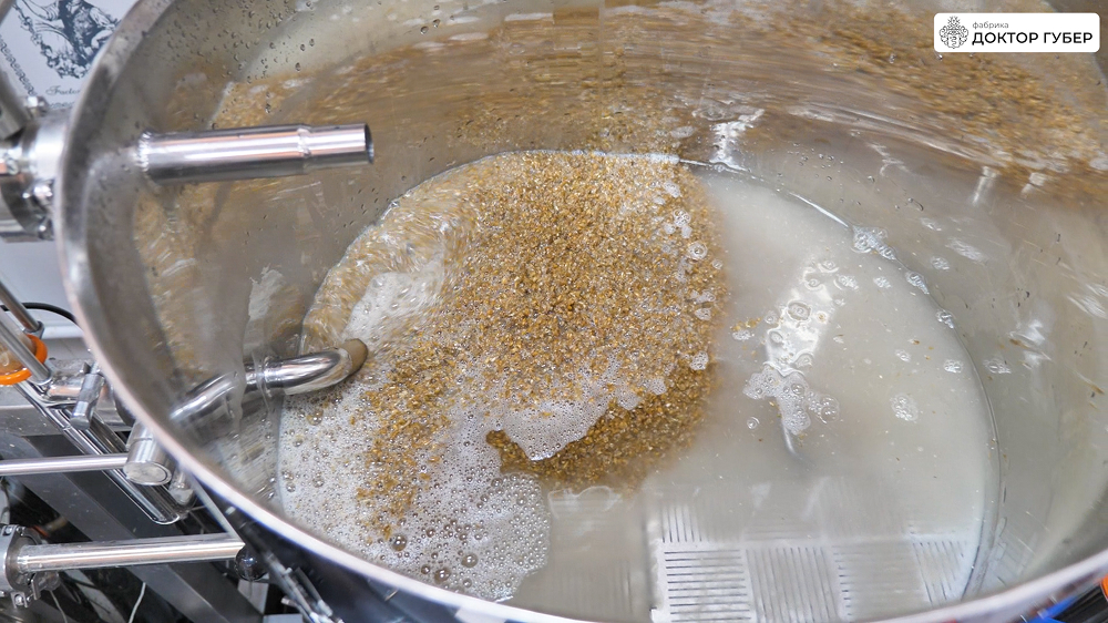 Солод предварительно измельчается на дробилке солода электрической до среднего помола, чтобы сохранить шелуху, которая обеспечит фильтрующий слой при перекачке сусла на охлаждение.