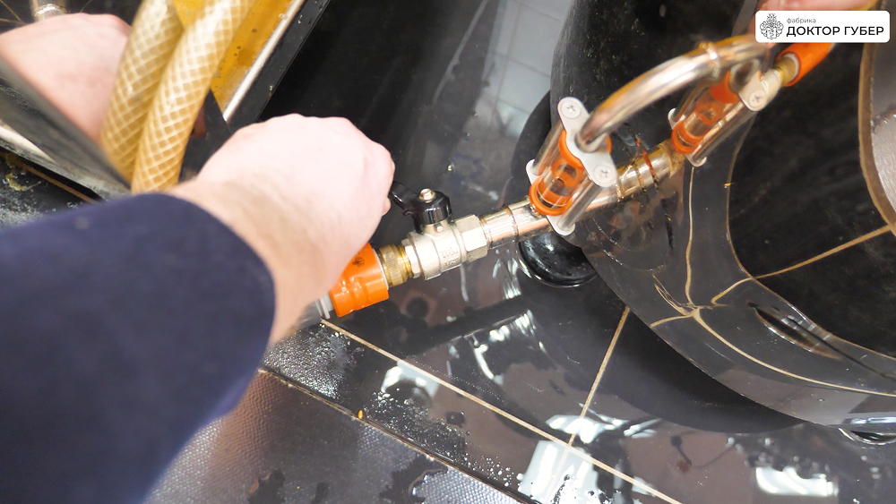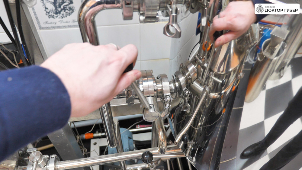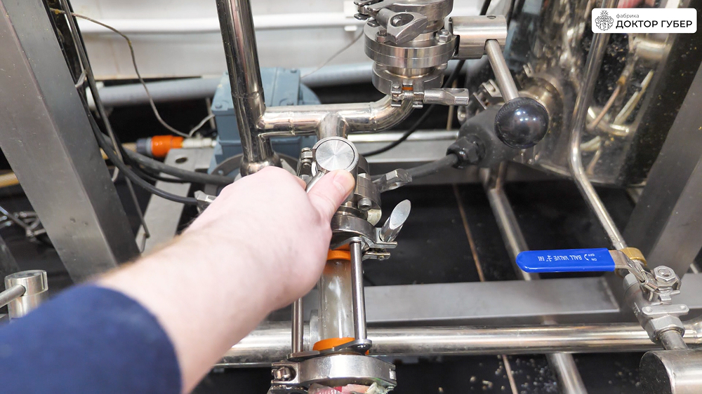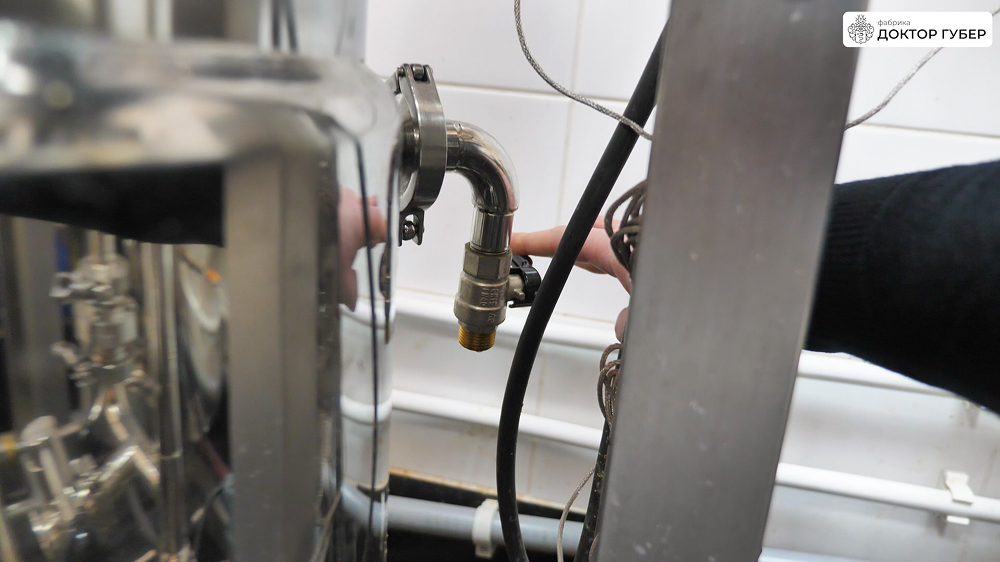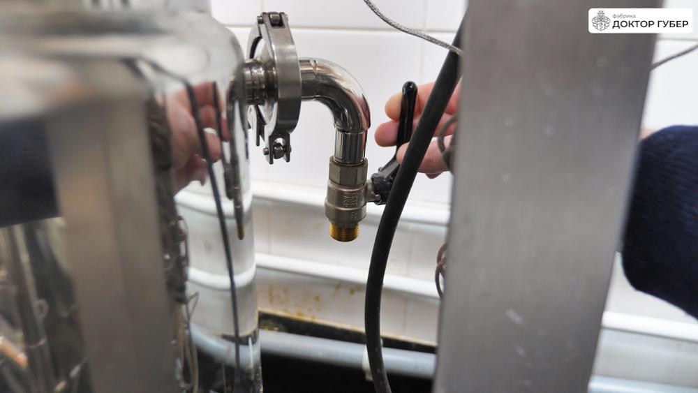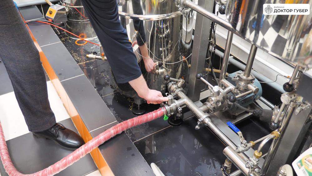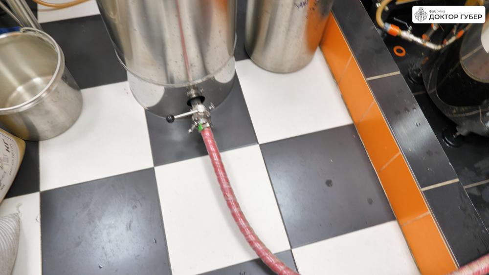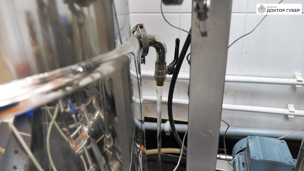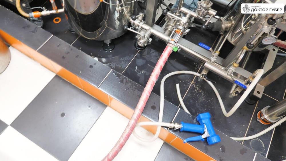 Отбродившую брагу аккуратно перекачиваем в ПВК пивоварни через пищевой рукав. Перед началом перекачки важно заполнить обвязку пивоварни и сам рукав водой — это предотвращает завоздушивание центробежного насоса и обеспечивает стабильную работу системы. Пищевую воду подаем в магистрали через коллектор пивоварни.