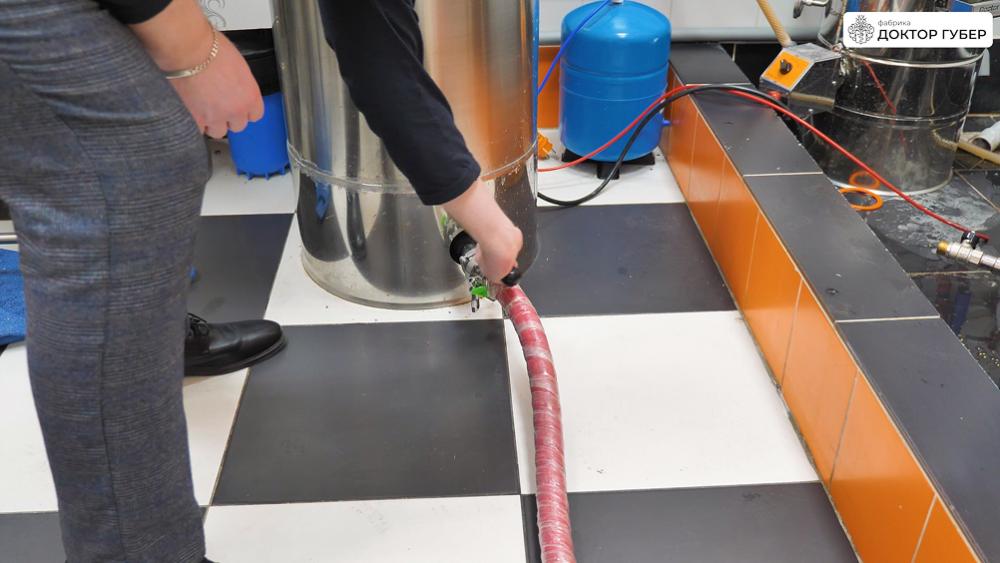 На верхний фильтр надеваем пищевой рукав, открываем слив из фильтр-чана и с помощью центробежного насоса подаем дистиллят в фильтрационную систему.