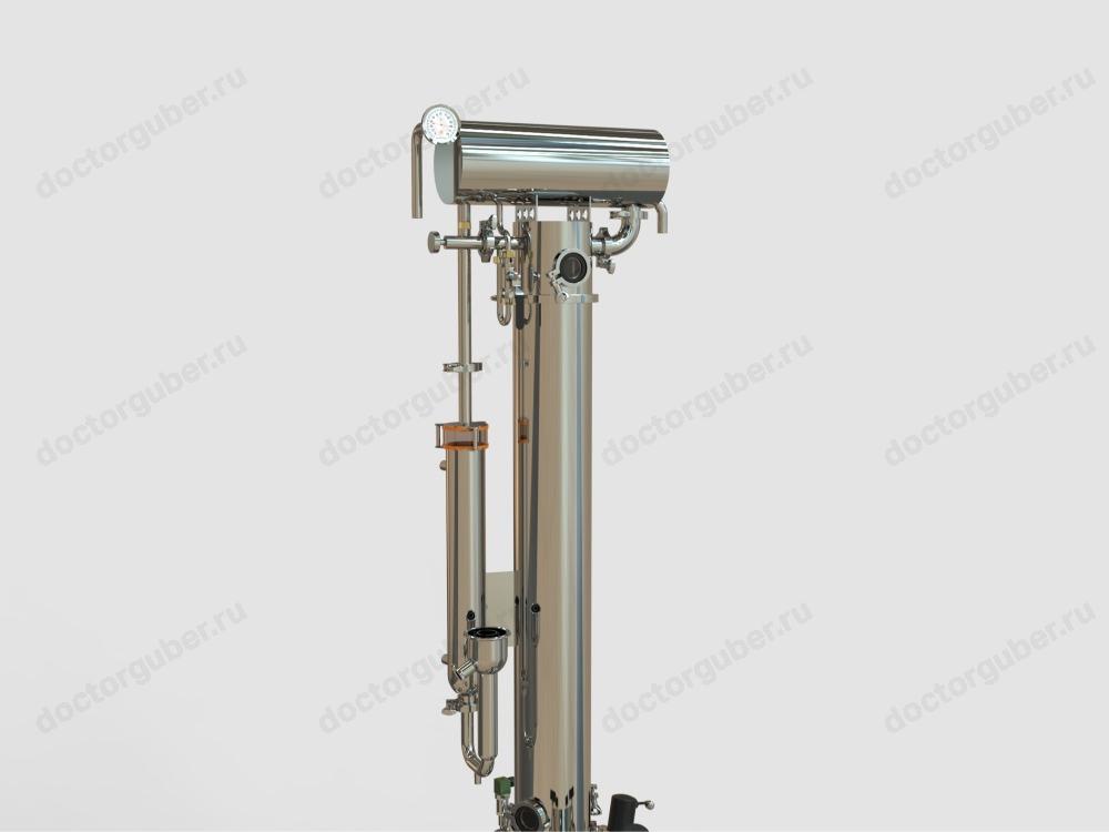 Элемент, отвечающий за охлаждение и конденсацию спиртовых паров. Здесь пары переходят в жидкую фазу и идут в отбор. Конденсатор оснащен смотровым диоптром для визуального контроля скорости отбора и стаканом с доохладителем, позволяющим точно замерять крепость продукта в струе.
