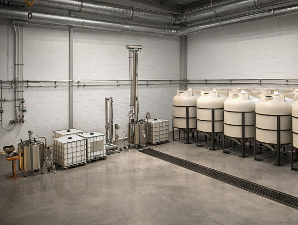 Сбор спирта-сырца и фракций в процессе перегонки, а также хранение готового спирта осуществляется в еврокубах, изготовленных из специального пищевого пластика, инертного к спирту.