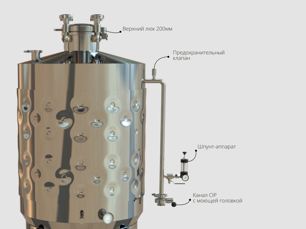 • Рабочее давление до 4 атм позволяет проводить брожение, дображивание и созревание пива в одной емкости. В том числе, появляется возможность производства игристых вин (шампанского).