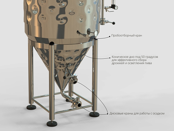 • Коническое дно ЦКТ выполнено под углом 50 градусов. Благодаря этому дрожжевые клетки не задерживаются на поверхности, а собираются в конусе и отделяются от пива с помощью крана.
