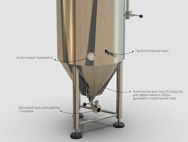 Конусообразное днище облегчает отвод дрожжевого осадка и твердых частиц через нижний клапан, способствуя чистоте напитка и точному контролю процесса брожения.