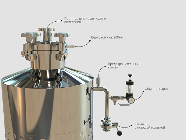Ёмкость выдерживает давление до 3 атмосфер, что делает её подходящей для первичного и вторичного брожения, а также карбонизации напитка прямо в ёмкости. Группа безопасности автоматически сбрасывает лишнее давление, защищая оборудование и персонал.