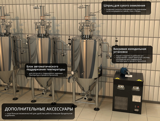 - Блок автоматического поддержания температуры для обеспечения точного контроля температуры брожения.
