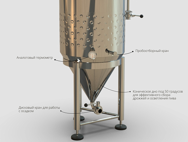 Коническая форма днища обеспечивает естественное оседание дрожжей и механических частиц, облегчая их слив через нижний клапан и позволяя получить чистое прозрачное сусло без посторонних примесей.