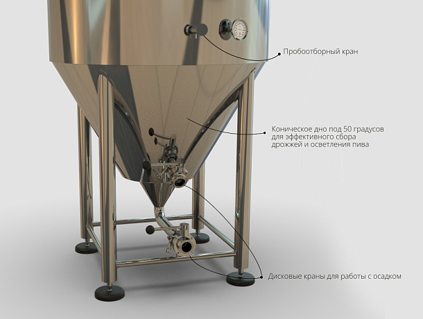 Конус с углом 50° позволяет дрожжам свободно стекать вниз, исключая их задержку на стенках. Это упрощает слив осадка и повышает прозрачность напитка.