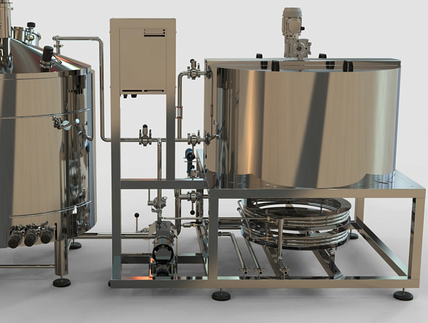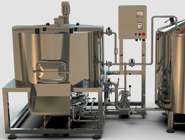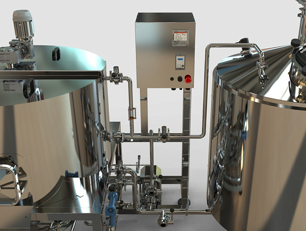 Котел и фильтр-чан соединены жесткой обвязкой с частотным преобразователем, регулирующим количество оборотов и скорость перекачки жидкостей между емкостями. В аппарат включены несколько моющих головок для безразборной CIP-мойки всех узлов пивоварни.