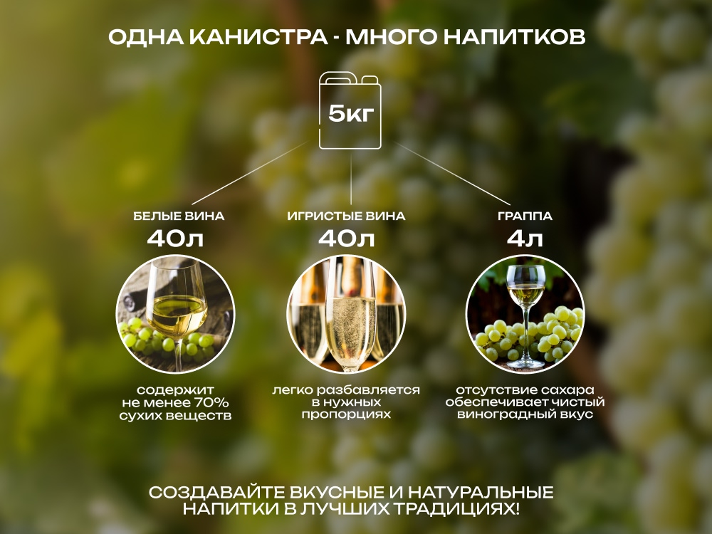 • 100% натуральность — для 5 кг концентрата используется до 50 кг свежего белого винограда. Без сахара, стабилизаторов и консервантов.