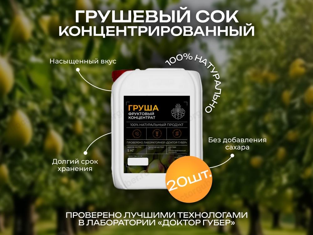 Концентрированный грушевый сок — это натуральный продукт, созданный исключительно из спелых плодов груши, собранных в стадии технической зрелости. Производится в России на мощностях партнёра «Доктор Губер» с использованием современных технологий: фрукты дробятся, из них получают сок прямого отжима, после чего он концентрируется путём бережного удаления лишней влаги.