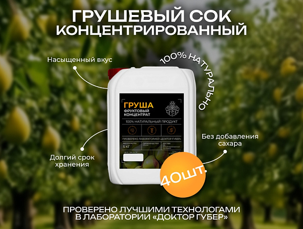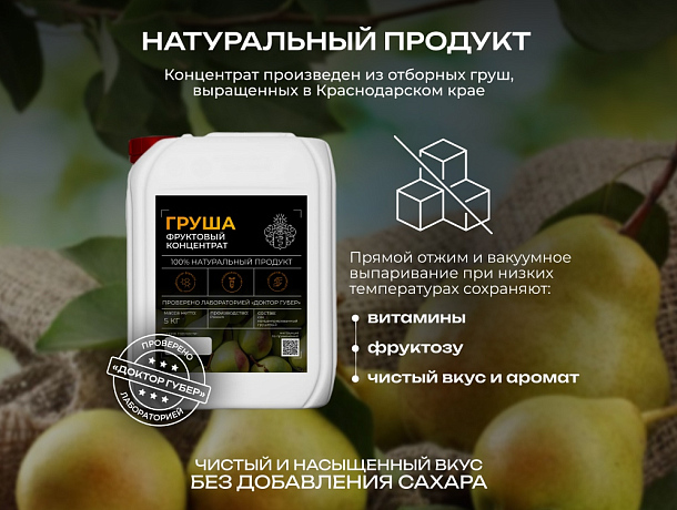 Натуральный концентрат из груш — это продукт, созданный без добавления сахара, ароматизаторов и консервантов. В его основе — плоды груши, собранные в период технической зрелости. Производство осуществляется в России партнёром «Доктор Губер», где применяется щадящая технология: дробление, отжим сока и его сгущение путём бережного удаления влаги.