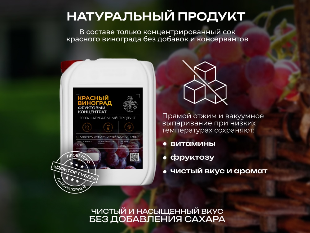 • 100% натуральный состав — на 5 кг концентрата перерабатывается до 50 кг свежего винограда;