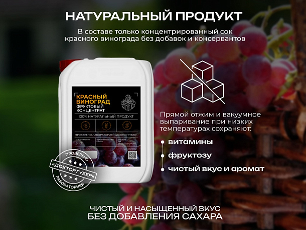 • Натуральность — для производства 5 кг концентрата используется до 50 кг свежего красного винограда;