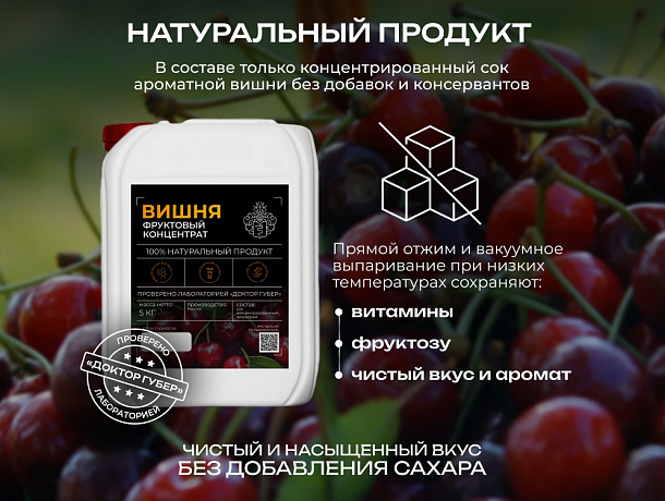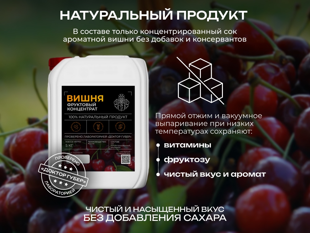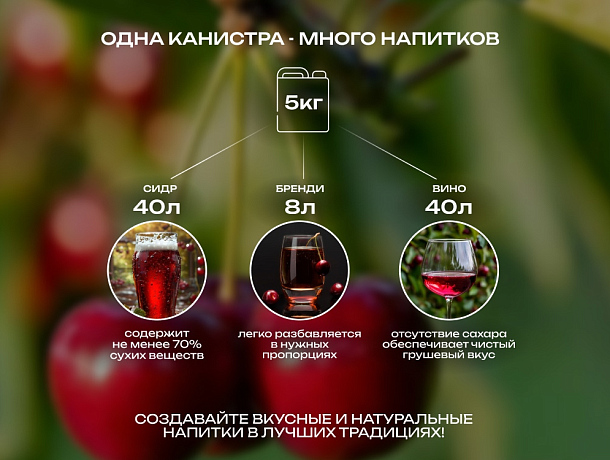 Создавайте дома напитки с насыщенным вкусом и ароматом спелой вишни! Концентрированный вишневый сок «Доктор Губер» — идеальная основа для приготовления вишневого сидра, фруктового вина, ароматного киршвассера или крепкого вишневого самогона.