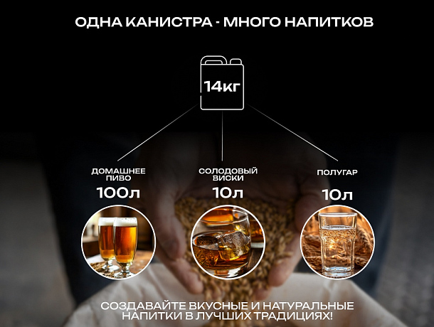 Одна канистра массой 14 кг позволяет приготовить до 100 литров пива или до 10 литров солодового виски.