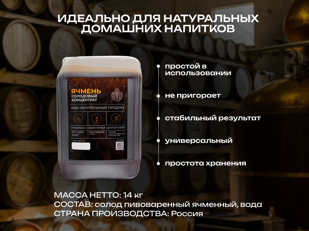 Концентрат изготавливается из тщательно отобранного пивоваренного ячменного солода по авторской рецептуре Фабрики «Доктор Губер». Каждая партия перед выпуском проходит лабораторный контроль, что обеспечивает стабильное качество, безопасность и соответствие заявленным характеристикам.