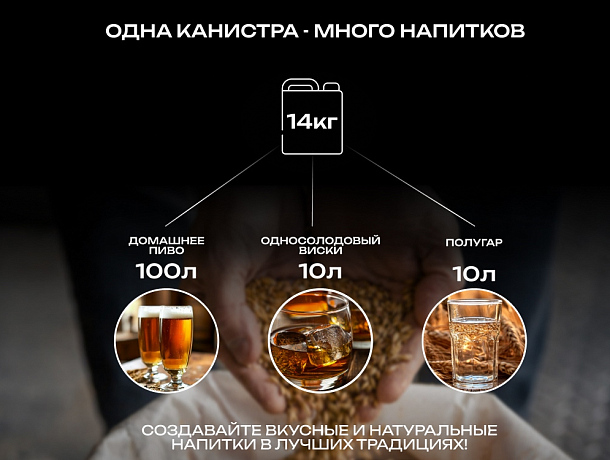 Одна канистра позволяет приготовить до 100 литров пива или до 10 литров виски.