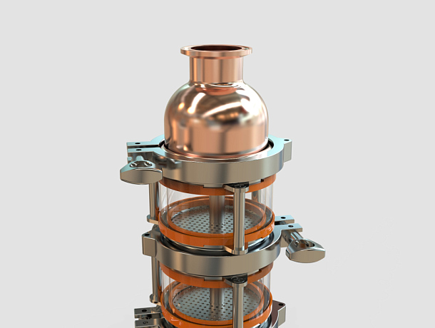 Сферический колпак, присоединение типа КЛАМП (с одной стороны 3’’, с другой 1,5’’). Со стороны 3’’ сделана выточка для установки внутрь колпачковой «тарелки» или перфорированного сита джин-корзины.