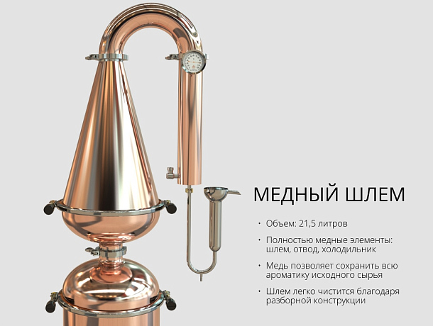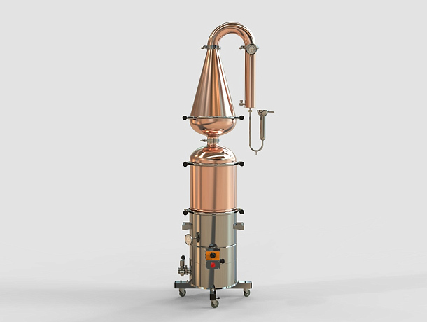 Особенный путь прохождения спиртовых паров по аппарату и увеличенная площадь их контакта с медью формируют глубокий и многогранный вкусоароматический профиль напитков, которые по качеству и органолептическим свойствам могут встать в один ряд с продукцией профессиональных ликеро-водочных заводов.