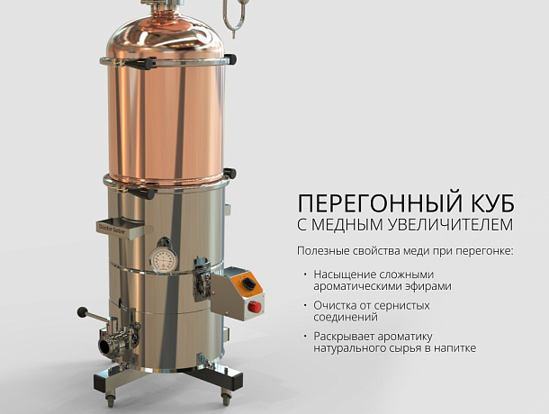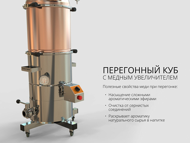 Особенность комплекса — медный увеличитель перегонного куба, который позволяет менять рабочий объем установки и площадь контакта спирта с медью в зависимости от задач и условий работы. Полный объем куба с увеличителем — 54 литра.