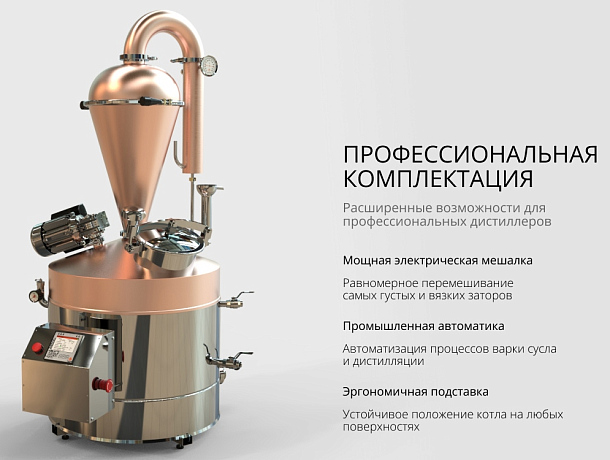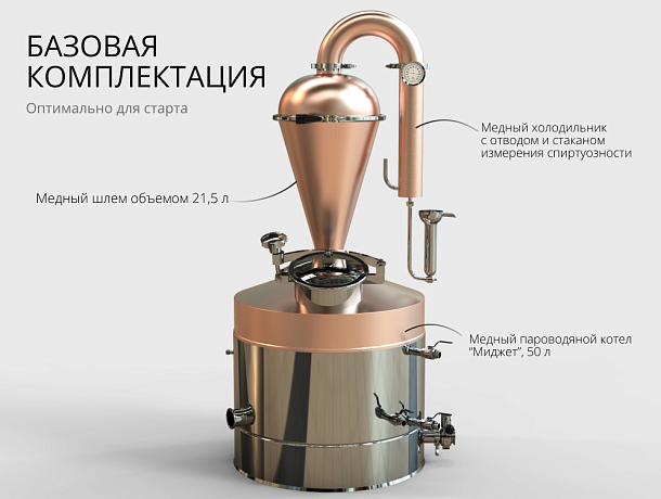 ПВК «Миджет» 50 л из высококачественной меди. Котёл обеспечивает равномерный и мягкий нагрев фруктовых браг, что особенно важно для деликатного сырья. Медь очищает сырьё от сернистых соединений , увеличивает выход ароматических эфиров и способствует формированию насыщенного ароматического профиля напитка с хлебными, карамельными и фруктовыми нотками уже на ранних этапах приготовления . Объём 50 литров оптимален для стабильной работы и точного контроля процесса перегонки.