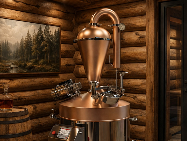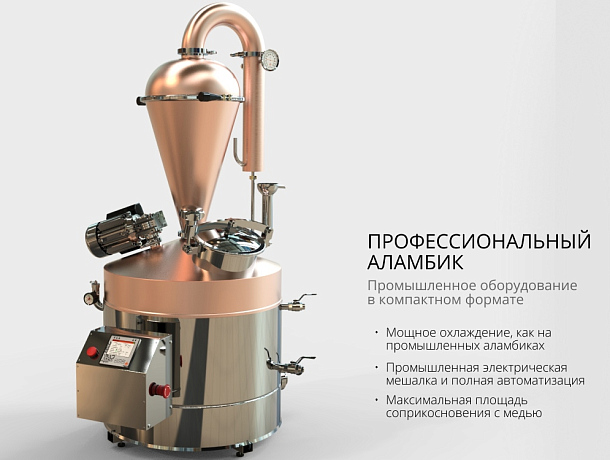 Назначение. Аламбик ориентирован на производство ароматных спиртов из фруктового и ягодного сырья: виноградные дистилляты коньячного типа, бренди, кальвадос, сливовица и другие традиционные напитки. Конструкция позволяет максимально сохранить летучие эфиры, формирующие ноты свежих и спелых фруктов, косточковых, цветочных и медовых оттенков. Результат — выразительный, чистый дистиллят с ярким характером исходного сырья.