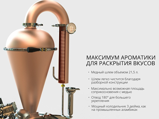 Медный шлем. Обеспечивает свободное движение паров без избыточного укрепления. Внутри происходит естественная частичная конденсация тяжёлых фракций с их возвратом в куб, при этом лёгкие ароматические соединения проходят дальше. Такая геометрия позволяет сохранить деликатность и многослойность фруктового профиля.