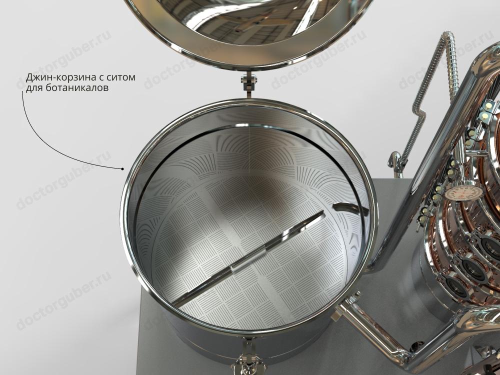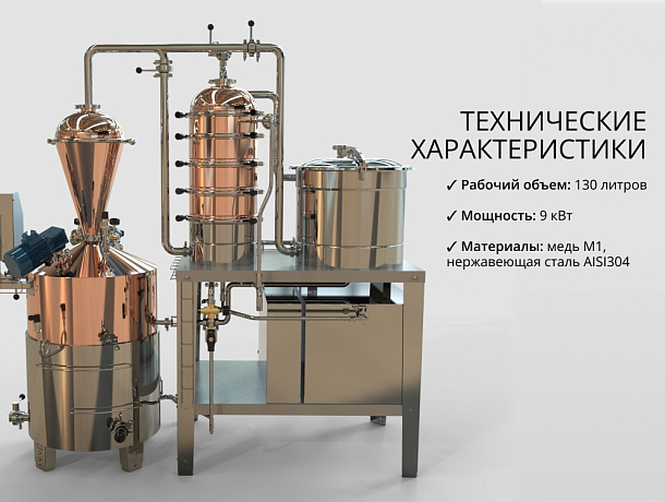 Объемный медный шлем усиливает естественную дефлегмацию, позволяя сохранить тонкие ароматические ноты сырья и придать напитку глубину.