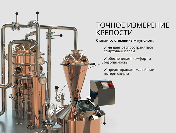 Система контроля спиртуозности со стеклянным куполом обеспечивает точность измерений и безопасность работы.