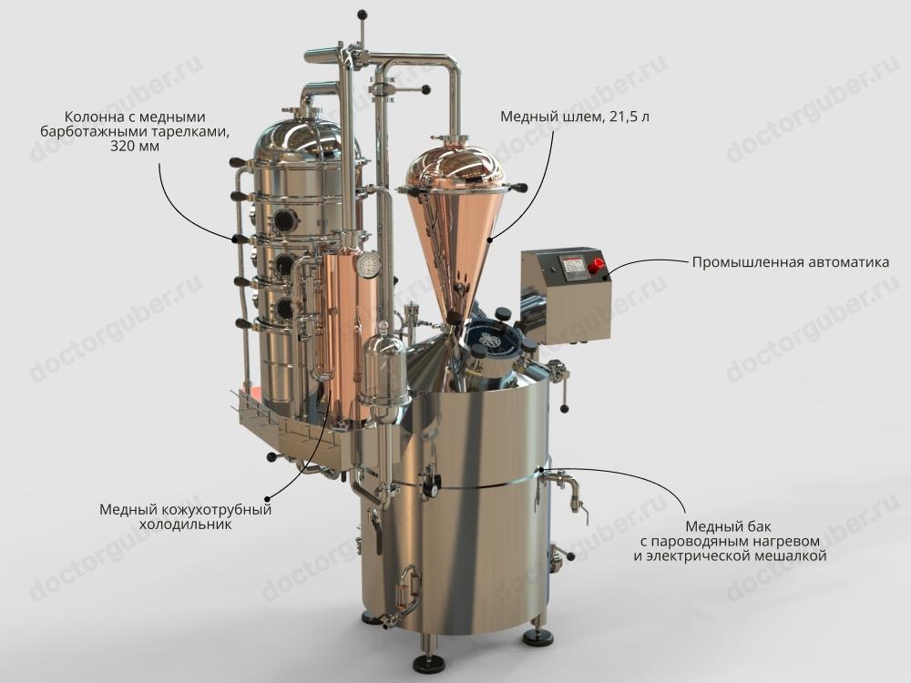 • Спирит стилл (перегонка через тарельчатую колонну) — пары проходят через медные колпачковые уровни, очищаясь от тяжёлых соединений, повышая крепость и чистоту спирта для водки и настоек.