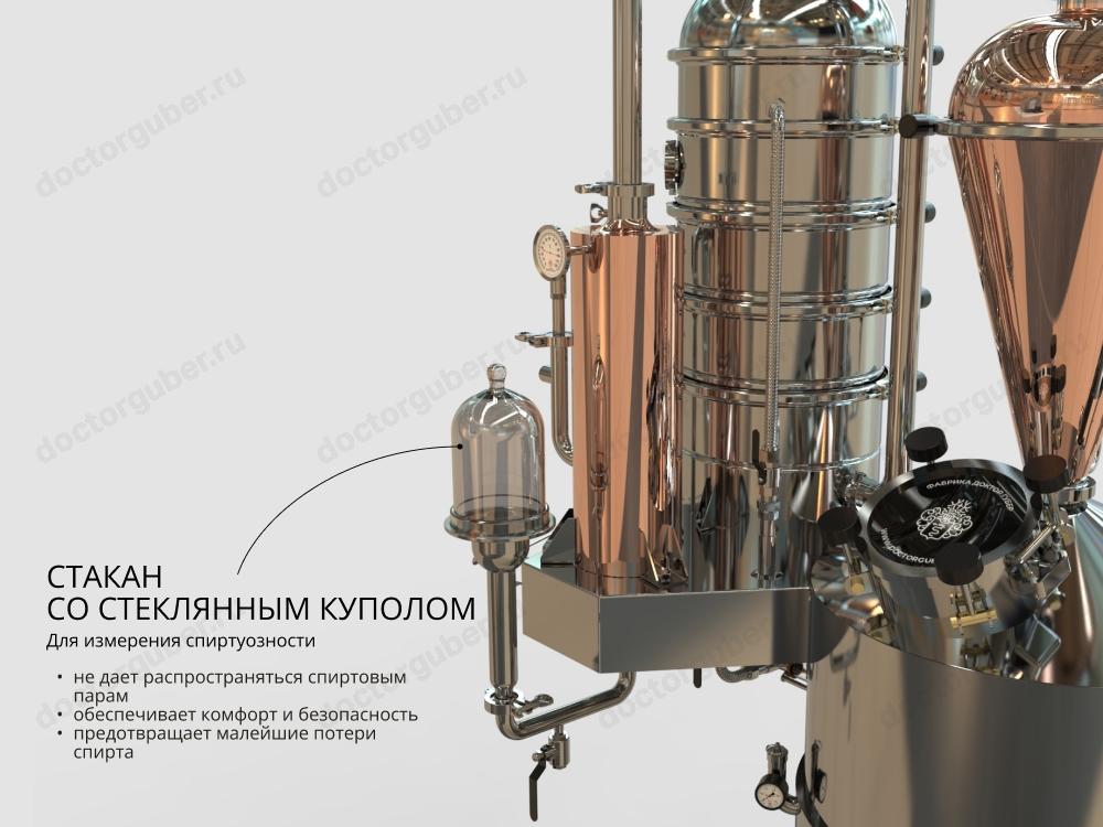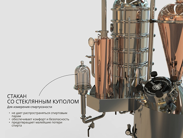• Стакан для измерения спиртуозности со стеклянным куполом предотвращает потери спирта и обеспечивает комфортную и безопасную работу.