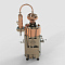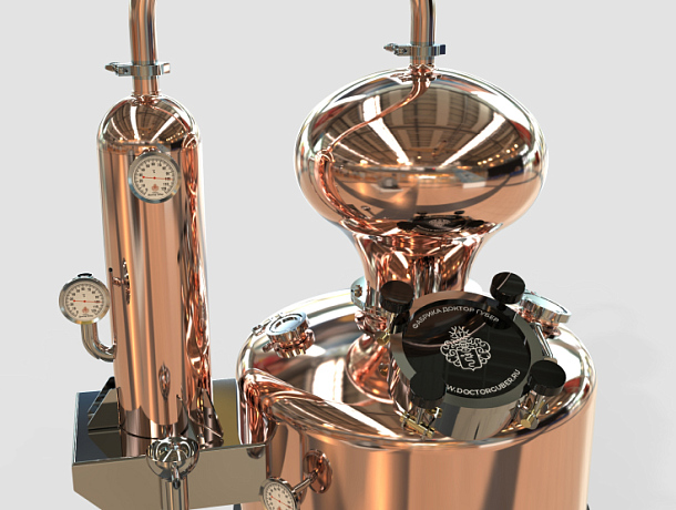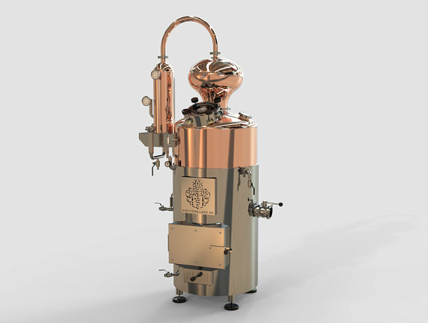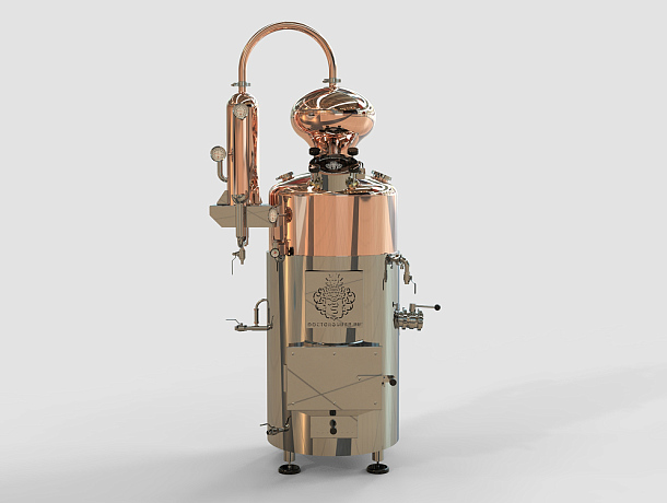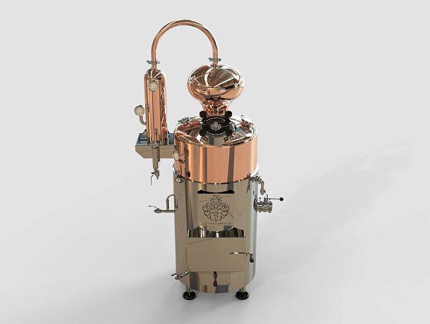 На бак установлен коньячный сферический шлем объёмом 40 л, изготовленный полностью из меди. Сочетание шарообразной формы и медного исполнения особенно хорошо работает с фруктовыми и ягодными брагами: шлем смягчает дистиллят и обеспечивает насыщенный органолептический профиль готового напитка.