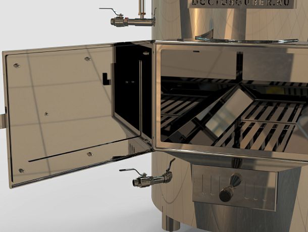 Подогрев пароводяной рубашки происходит от твердого топлива, что позволяет использовать дрова, пеллеты и тд. Это делает аппарат полностью автономным.