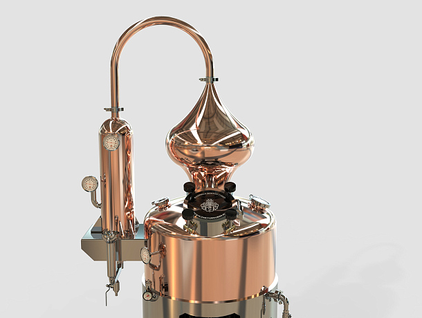 На бак установлен классический вискарный шлем в форме луковицы. Объём шлема 40 литров. Луковичная форма способствует возвращению тяжёлых фракций обратно в котёл и позволяет отделить «тело» дистиллята с максимальной точностью. В результате получается напиток с глубокой текстурой и сложным ароматом, которые особенно ценятся в зерновых и солодовых напитках.