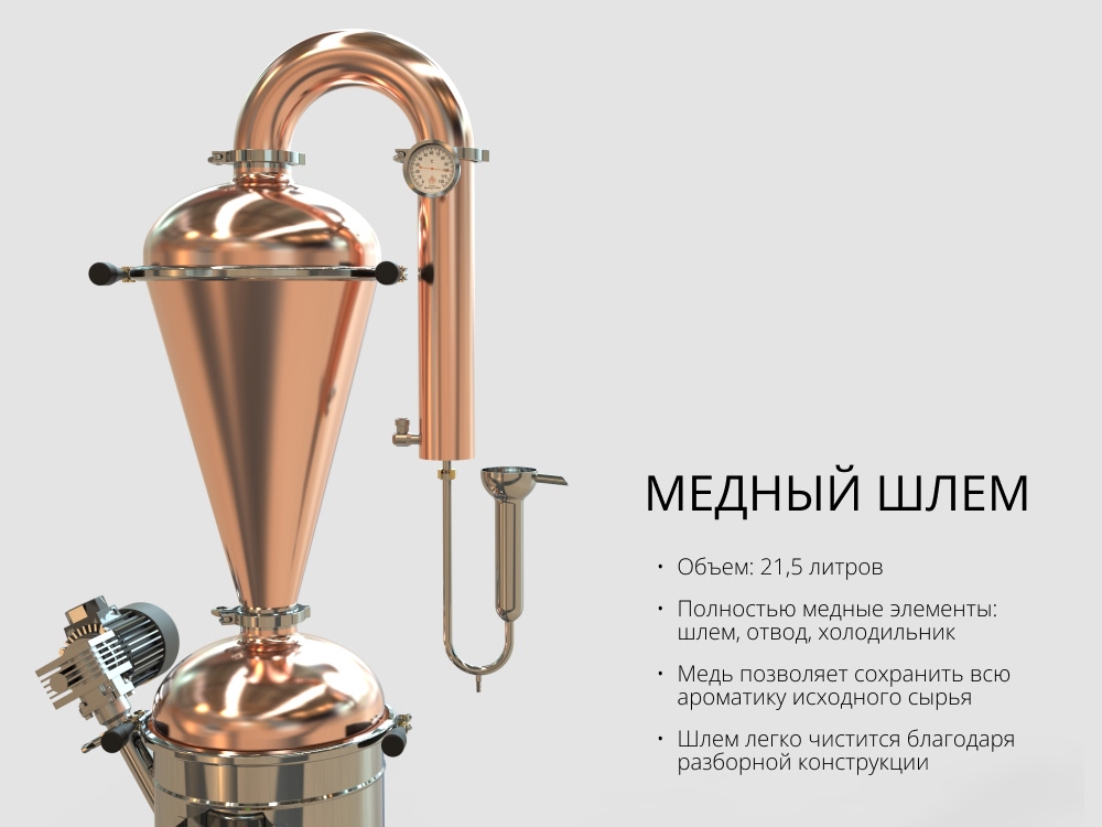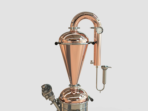 Усложненная траектория движения пара по аппарату и большая площадь соприкосновения с медью формируют богатый и многогранный органолептический профиль напитка, чье качество и вкусоароматические свойства могут сравниться с продукцией профессиональных ликеро-водочных заводов.