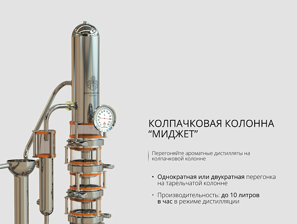 Универсальная система «Миджет 3.0» с медной тарельчатой колонной позволяет готовить любые ароматные спирты: зерновой, фруктовый, сахарный и другие. На колонну устанавливается запатентованная голова «Миджет» — уникальная разработка, компактно соединяющая дефлегматор и холодильник.