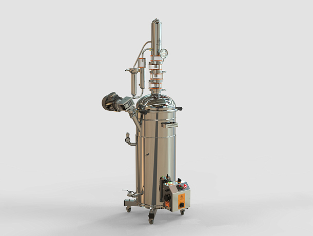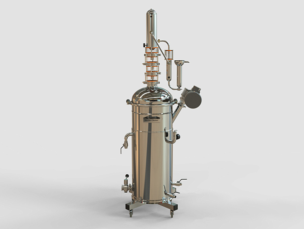 В тарельчатой колонне четыре уровня с запатентованными уровнями моно-арома из нержавеющей стали и прозрачными смотровыми диоптрами для отслеживания скорости отбора и консистенции отбираемых фракций. Колонна легко поддается модификации: ее можно дополнить новыми уровнями, поставить медные тарелки для дистилляции или вовсе заменить тарелки на джин-корзины для получения джина из ягод, фруктов и специй.