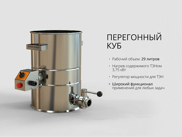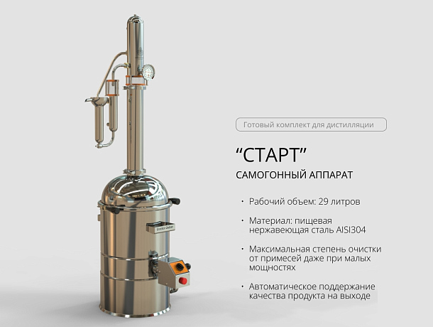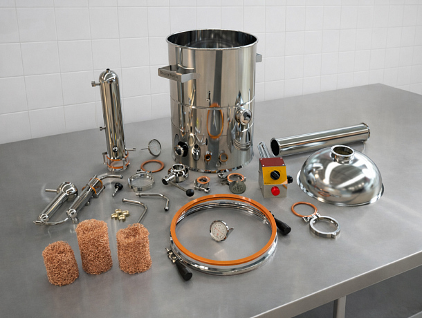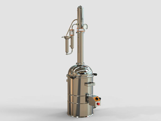 В основе аппарата - компактный перегонный куб на 29 литров с регулятором мощности нагрева