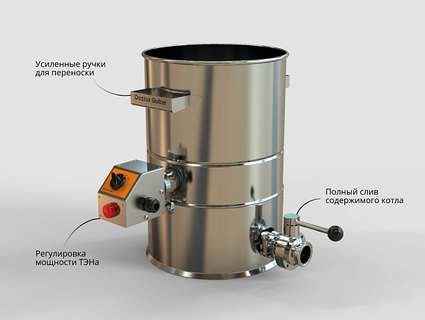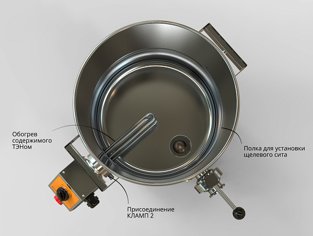 • Прямой нагрев содержимого ТЭНом 3,75 кВт. Мощность нагрева регулируется переключателем. Шаг 0 - 1,25 - 2,5 - 3,75 кВт.