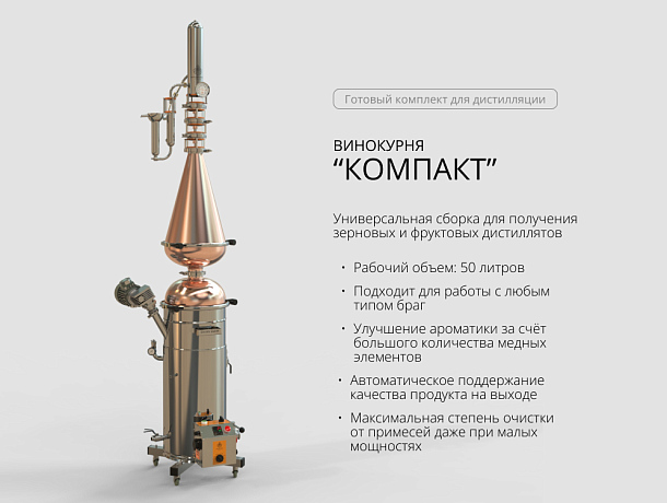 Винокурня «Компакт» — компактный вариант домашней винокурни, которая закроет все задачи по приготовлению зерновых и фруктовых дистиллятов.