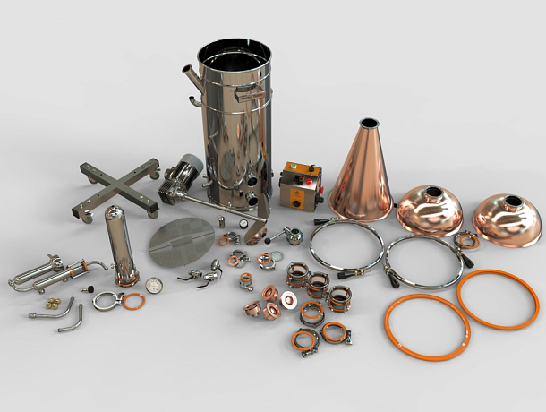Тарельчатая колонна и конический медный шлем в одном комплекте дает возможность экспериментировать со способами дистилляции и получать широкий спектр ароматных напитков.