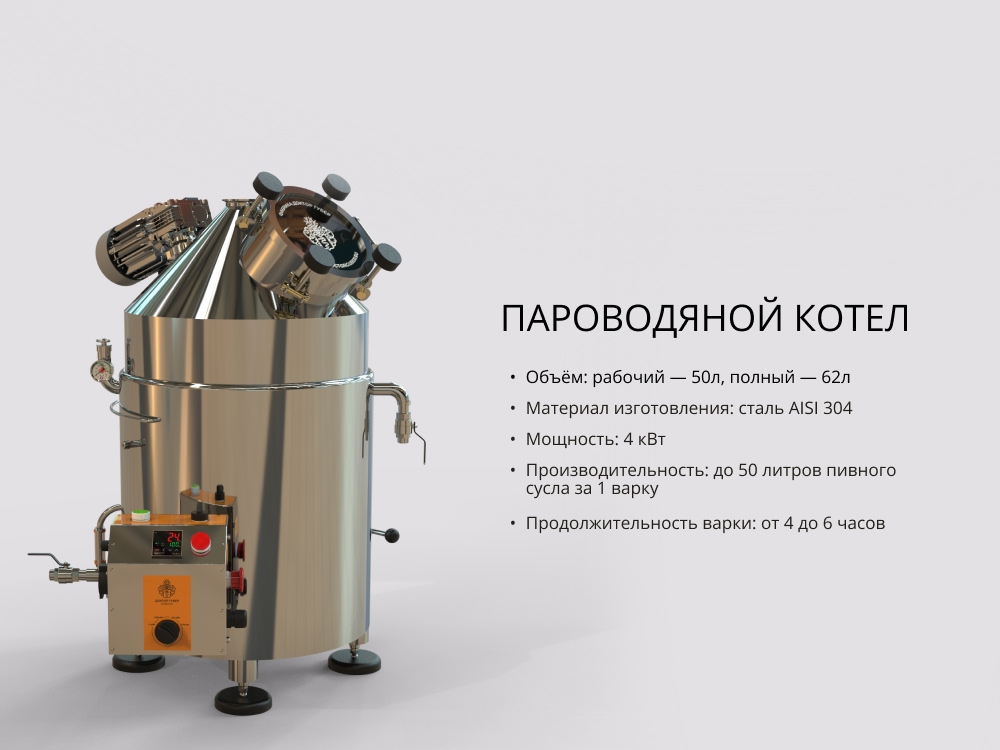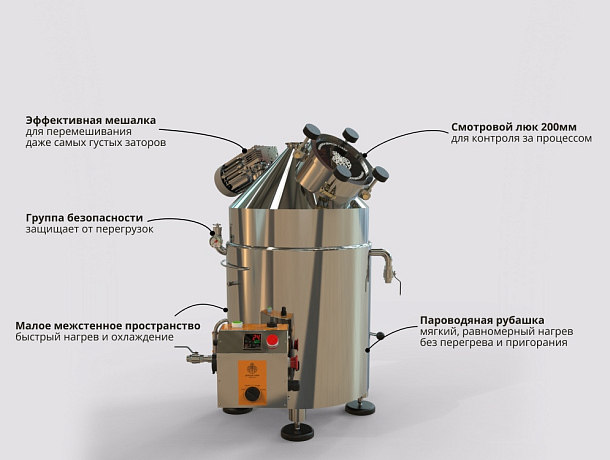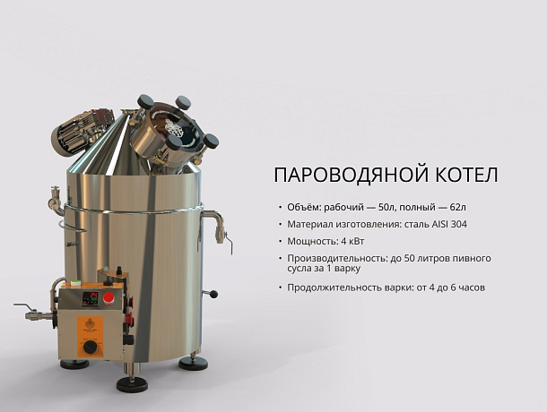 Котёл снабжён датчиками температуры, давления и предохранительными элементами, а также предусмотрен выход под паровой отвод, медный шлем или дистилляционную колонну — идеальная основа для модернизации и расширения возможностей.