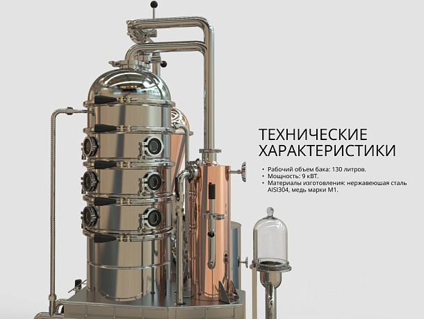 - Медный шлем и барботажная колонна позволяют производить вкусные дистилляты, насыщенные летучими ароматными эфирами и очищенные от сернистых соединений.