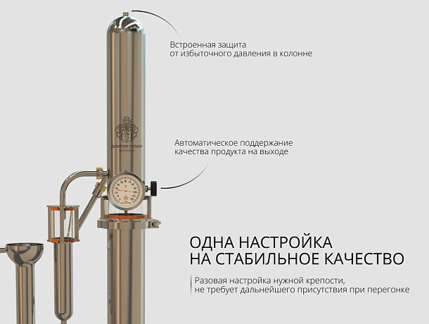 Вы можете контролировать и регулировать количество возвращаемой в колонну флегмы с помощью смотрового диоптра и специального крана, таким образом регулируя крепость спирта.
