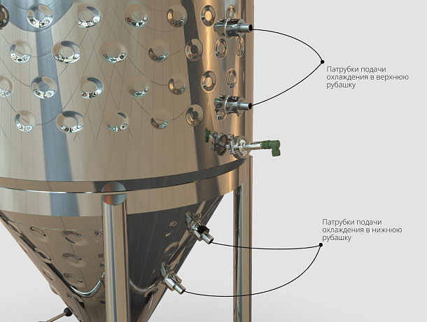 • 2 независимые рубашки охлаждения на конусе и цилиндре ЦКТ для поддержания температурного режима на этапах брожения и дображивания. Рубашка в конусе ЦКТ позволяет эффективно захолаживать и снимать дрожжевые клетки. Малый объем рубашек охлаждения обеспечивает эффективное охлаждение емкости с минимальным расходом хладагента. Панельно-динамические рубашки охлаждения выдерживают напор охлаждающей жидкости до 16 атмосфер и не боятся перепадов давления.