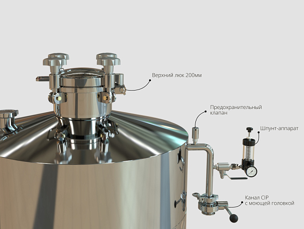 • Рабочее давление до 4 атм позволяет проводить брожение, дображивание и созревание пива в одной емкости. В том числе, появляется возможность производства игристых вин (шампанского).