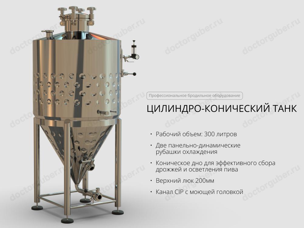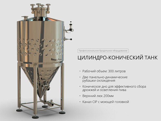 ЦКТ 300 литров с рубашкой охлаждения — цилиндроконический танк для профессиональной организации брожения алкогольных и безалкогольных напитков с возможностью последующего дображивания и созревания под давлением. ЦКТ идеально подходит для сбраживания: