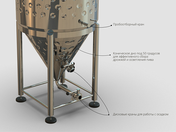 • Коническое дно ЦКТ выполнено под углом 50 градусов. Благодаря этому дрожжевые клетки не задерживаются на поверхности, а собираются в конусе и отделяются от пива с помощью крана.