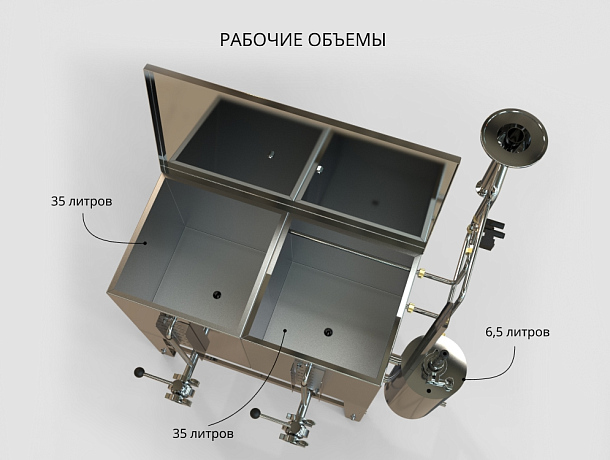Конструкция совмещает три емкости для отбора фракций в процессе дистилляции: головной, хвостовой и «тела» продукта.